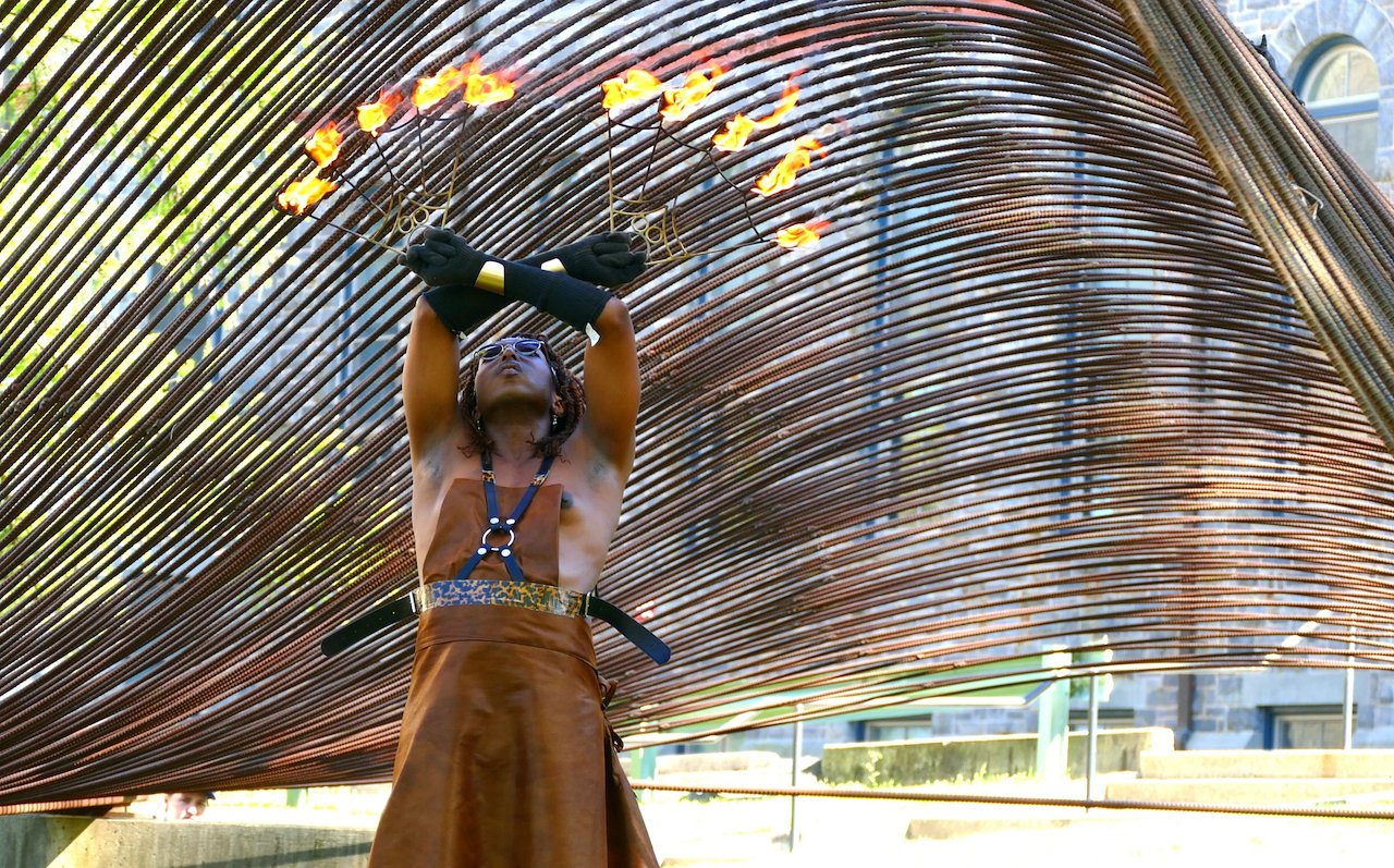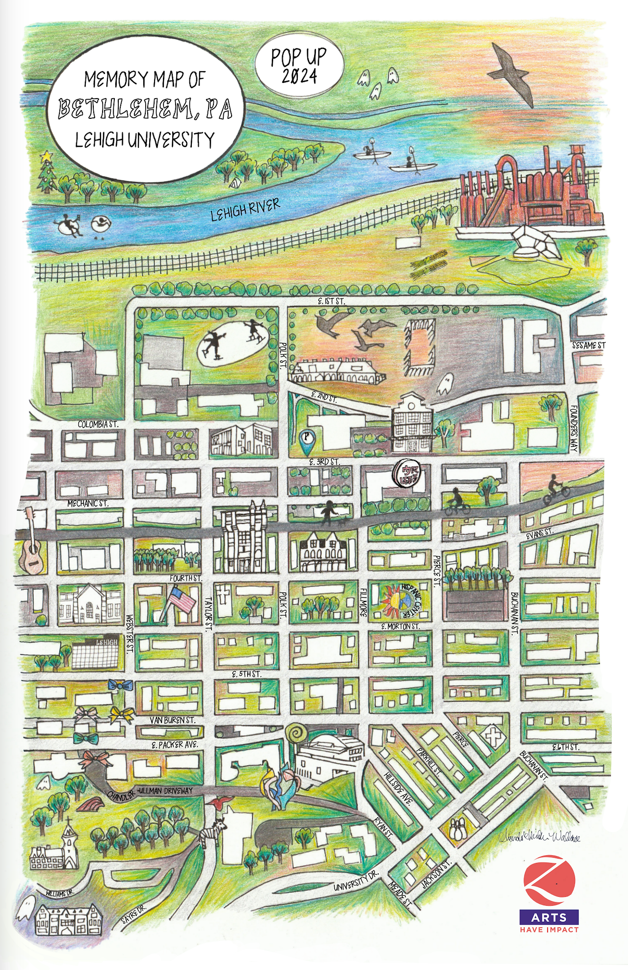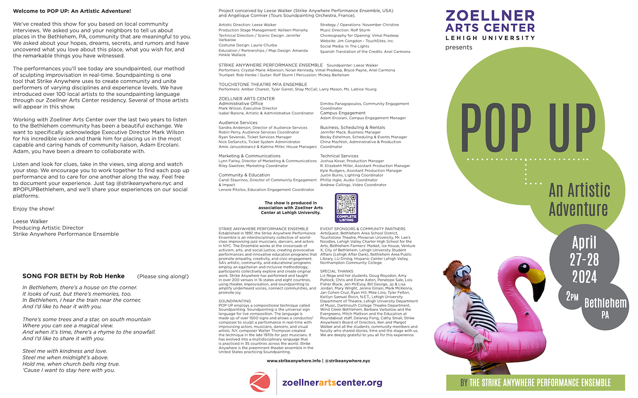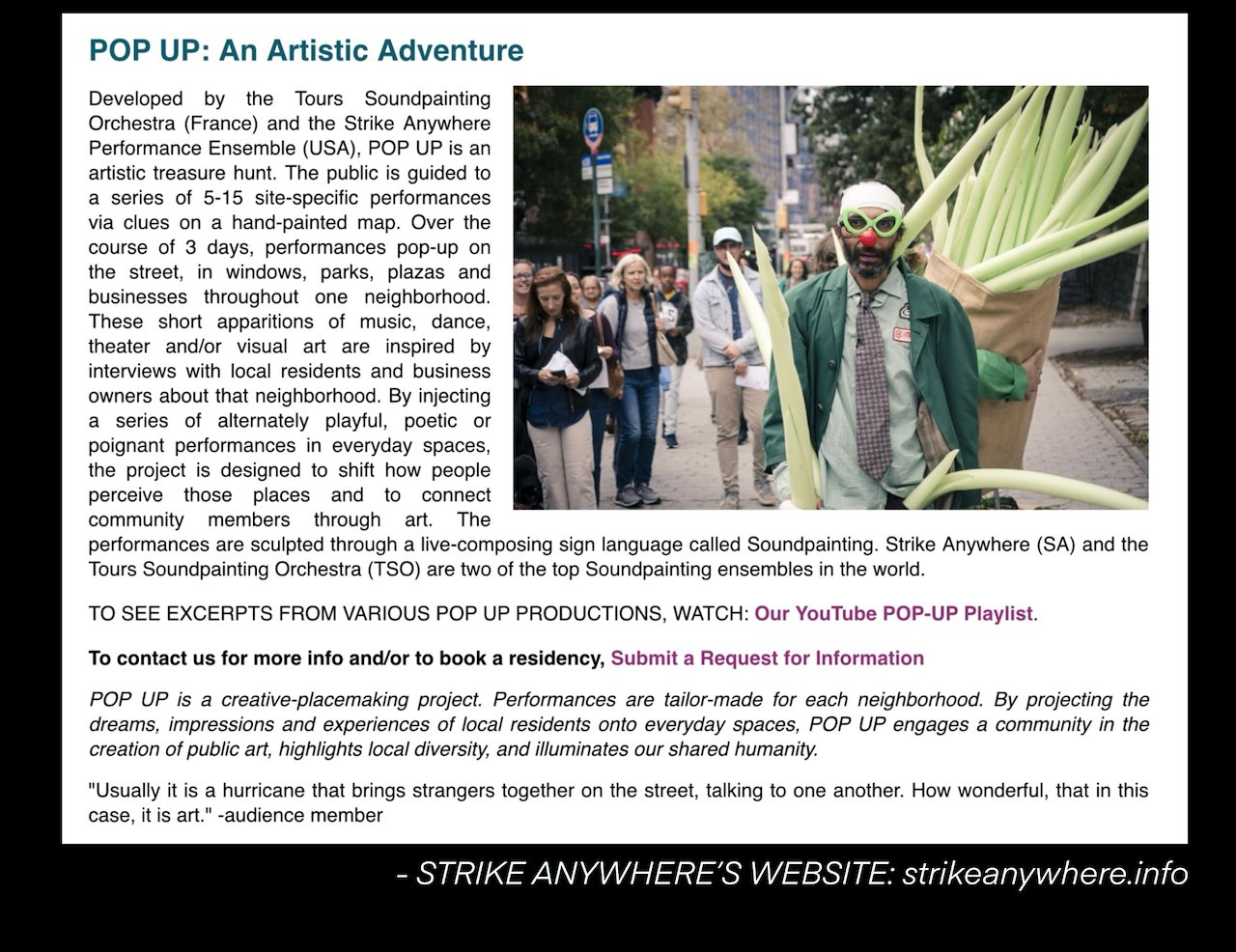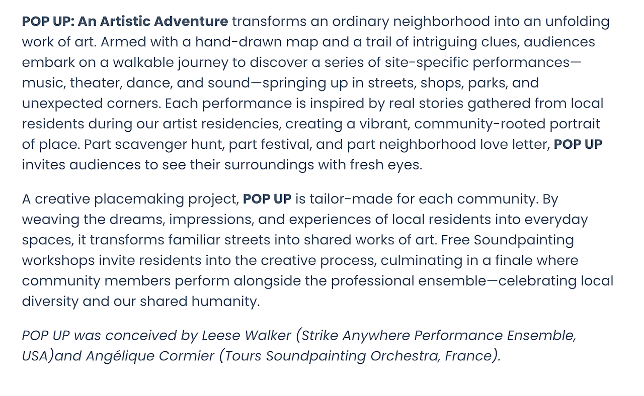In POP UP: an Artistic Adventure, the public was guided to a series of site-specific performances via clues on a hand-painted map. These short apparitions of music, dance, theater and/or visual art were inspired by interviews with local residents.